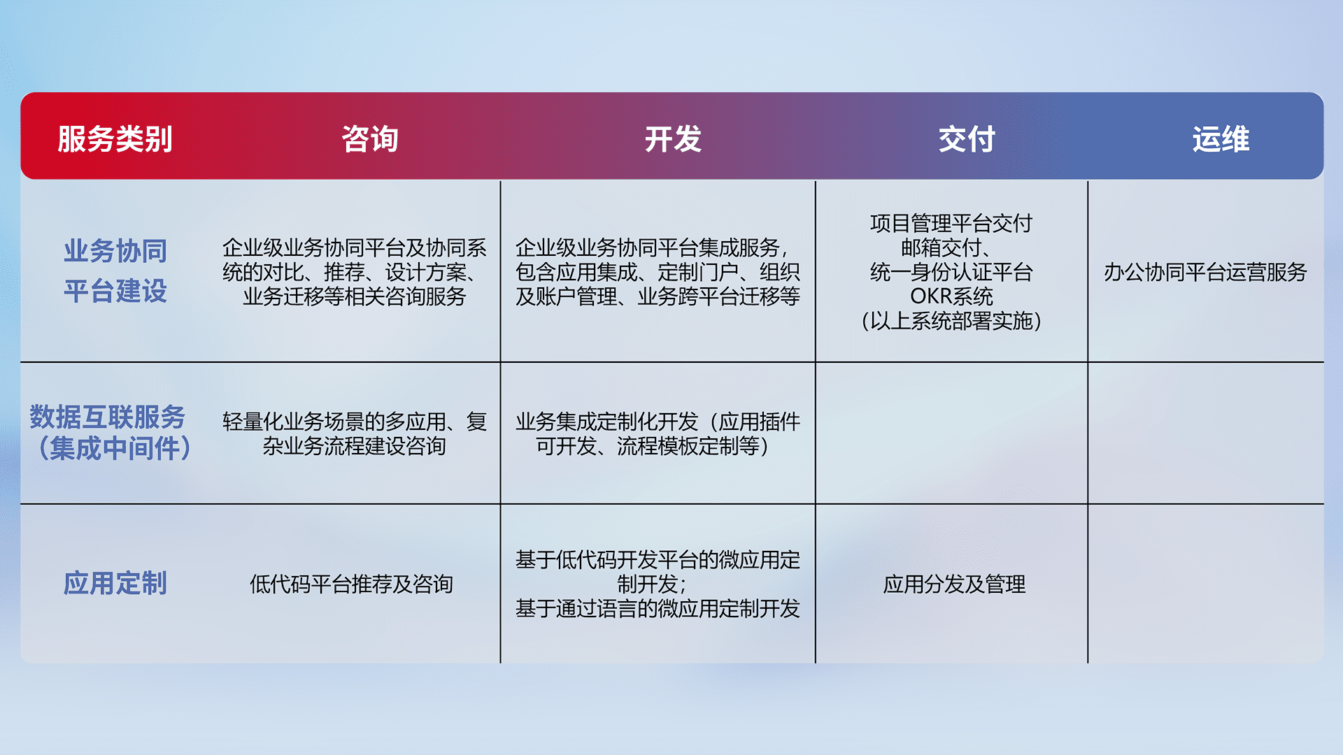针对钉钉、、、企微、、IDaas等平台级产品提供产品的规划、、、方案、、、、交付、、定制化开发等服务,,实现如统一协同办公、、、智能客户服务、、混合会议管理、、、智能数据查询、、等业务场景,,,,实现数字化转型。。。