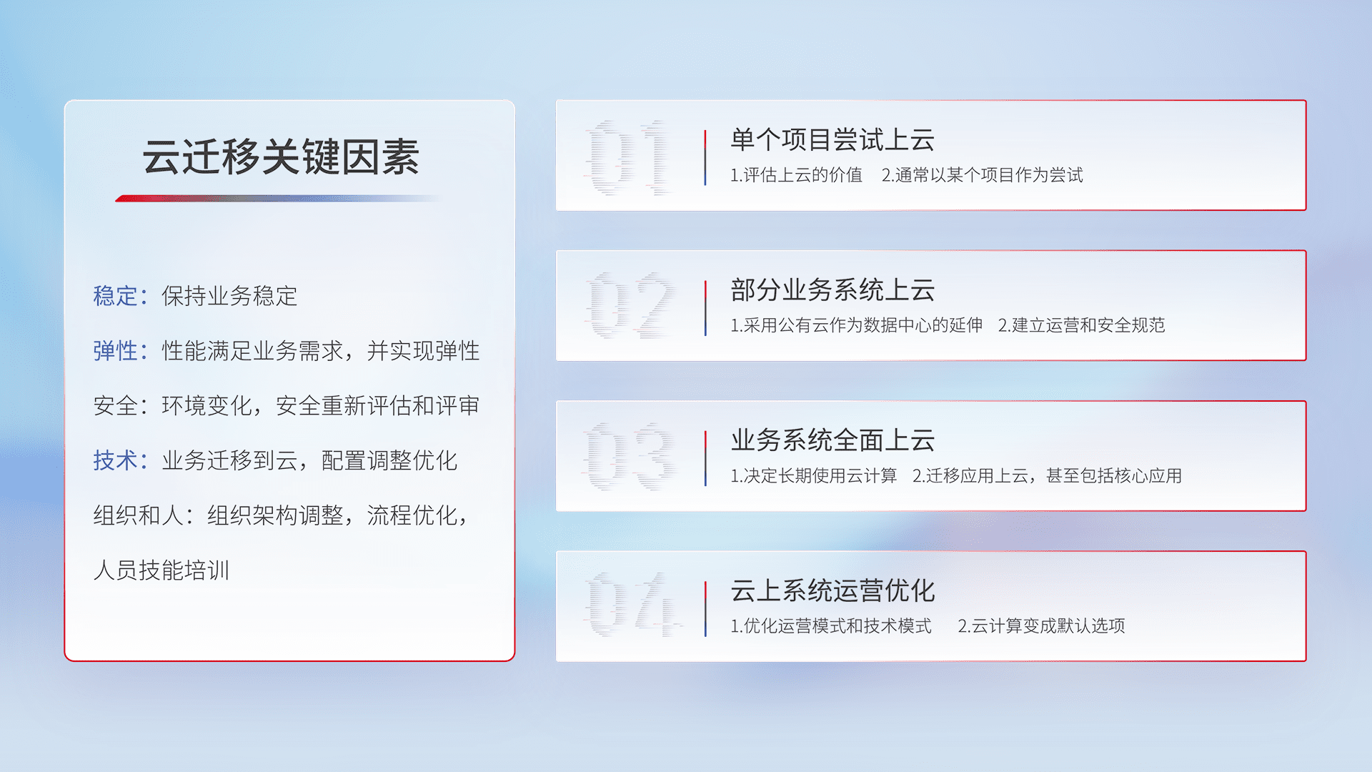 结合实际业务,,,从规划设计、、、云平台选型、、、云原生改造、、数据迁移、、、集成交付,,迁移全过程为客户识别最佳上云路径,,做好风险识别管理,,,设计网络架构、、、、身份权限、、安全审计合规、、、操作审计、、、日志审计、、监控告警策略、、多站点容灾设计等,,,,对云上基础设施进行整体规划,,提升IT治理水平,,,以满足弹性、、高可用、、、高性能的需求。。。。