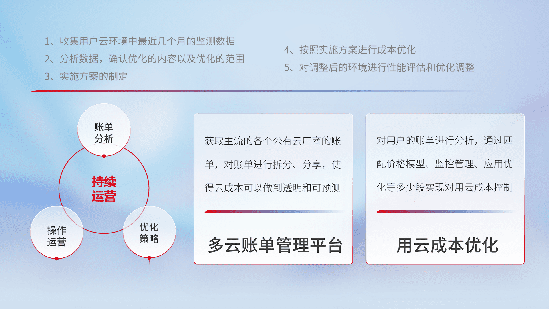 通过多云纳管,,,以统一的资源数据模型把客户的云资源进行抽象和封装,,进而实现对多云资源的统一操作,,保障云资源管理的可靠性、、稳定性与可用性。。。量身定制化运维内容,,,配置、、、开发运维、、补丁管理、、备份、、监控、、认证和访问管理、、、、审计和日常巡检等,,,,保障在用云过程中的可靠度,,稳定度以及高可用率。。