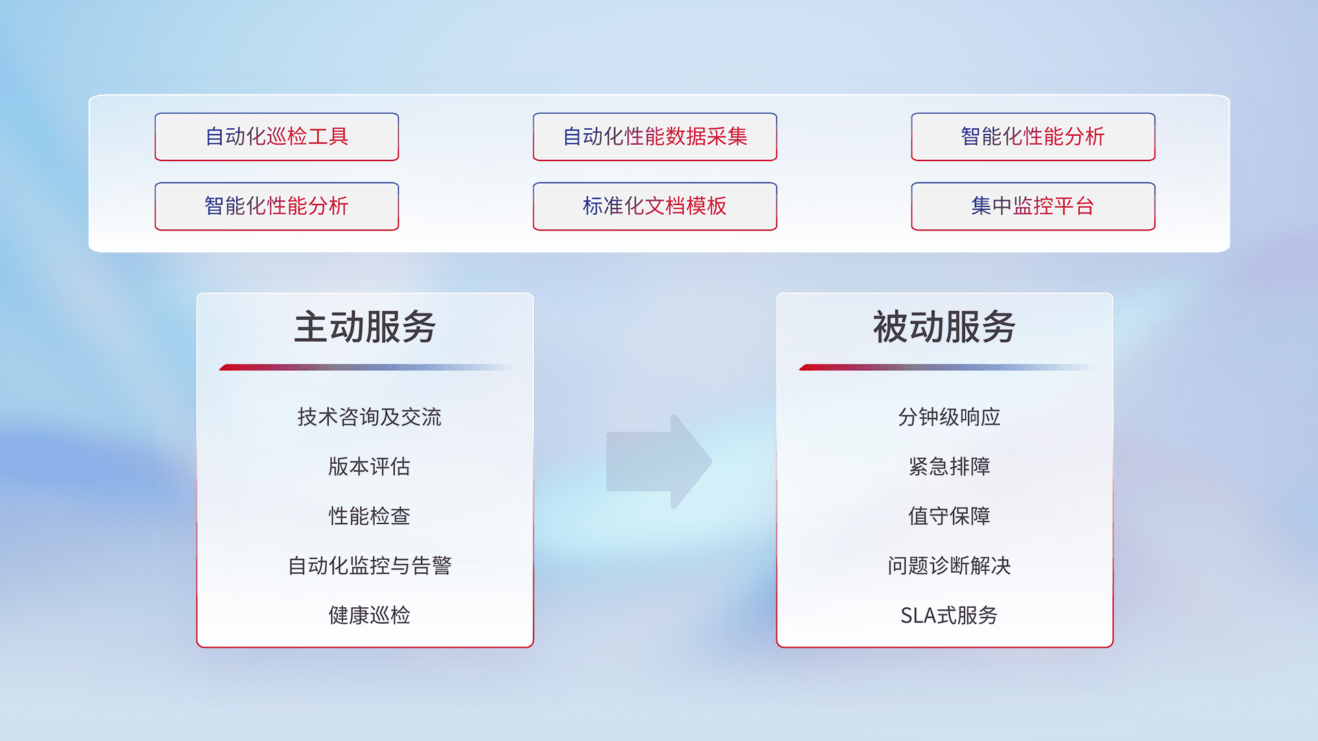 智能化工具和标准化文档,,保障服务质量,,,提供主动服务(包含技术咨询、、、、版本评估、、、、性能检查、、、自动化监控与告警、、、健康巡检)和被动服务包含(分钟级响应、、、紧急排障、、、值守保障、、、、问题诊断解决、、、SLA服务)。。。